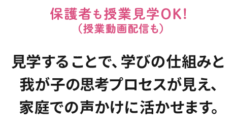 Q. ついていけるか心配です。 A. 授業中は、授業を進めるメインファシリテーターとは別に、クラスファシリテーターと呼ばれるスタッフが、各クラスに2〜3名同席し、子どもたちのサポートをします。 低学年のお子様に言葉をかみ砕いて伝えたり、内に秘めるタイプのお子様の発言を引き出したり、子どもたちが安心して楽しんで授業に参加できる環境を作っています。