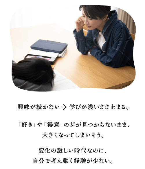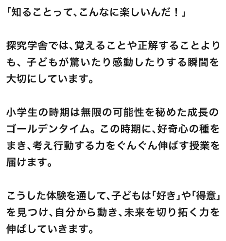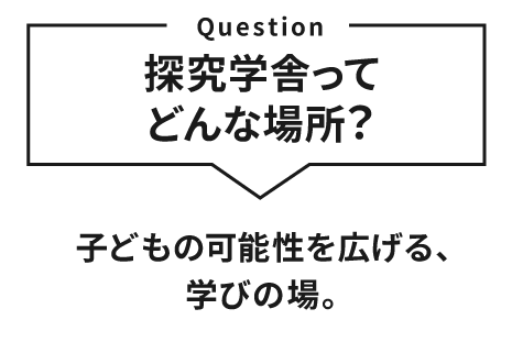 Q. 他の学習塾と何が違いますか? A. 探究学舎の学びでは、暗記や正解をすることを重視していません。大切にしているのは、自ら問いを立て、考え、答えを導き出すプロセス。間違ってもいい環境で、自ら考える楽しさを味わうことで、子どもたちは「学ぶって楽しい」ということを体感します。